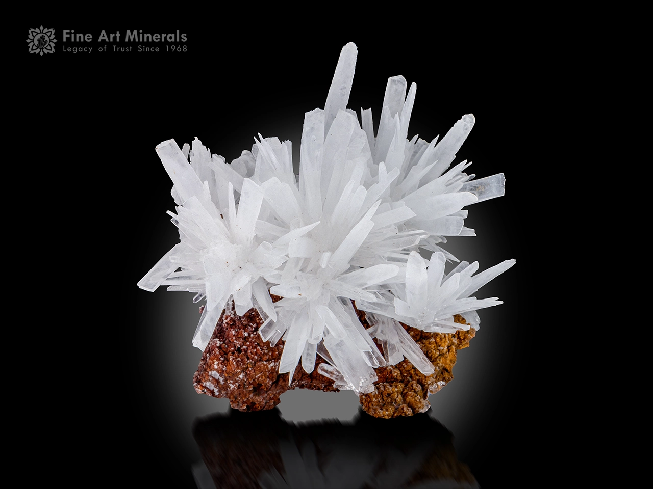 There is a natural charm in the way aragonite forms these radiant clusters, and this specimen captures that beauty beautifully. A dense grouping of elongated crystals rises gracefully from the limonite matrix, each crystal showing sharp terminations and a well-defined habit. The translucent white tones give the piece a soft, luminous appearance, while the warm, earthy limonite matrix provides a rich contrast that enhances the overall visual appeal. The crystals are in good condition and display a pleasing balance, with a strong front-facing presentation that makes the specimen especially attractive. A fine and captivating example of aragonite with excellent natural growth and aesthetic presence.