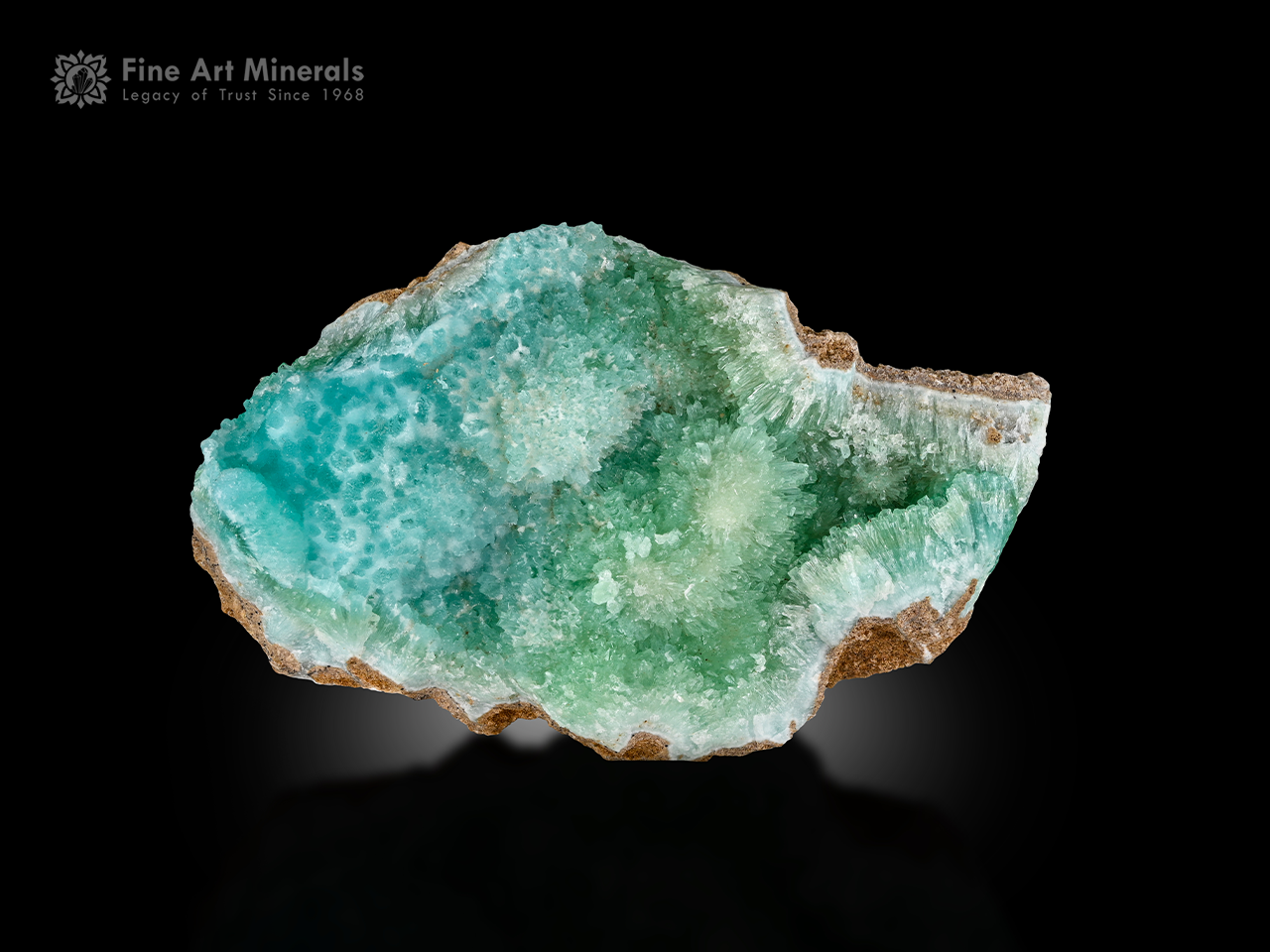 A fine aragonite specimen from Afghanistan shows a beautiful blend of aqua green and soft mint tones that shift gently across the surface, giving the piece a serene and refreshing presence. The crystal growth forms delicate, radiating clusters that resemble frozen splashes of water, each spray exhibiting intricate detail and a luminous internal glow. The center carries a slightly deeper green that lightens toward the edges, creating a natural gradient that enhances the sculptural shape. The surrounding matrix adds an earthy balance, contrasting the cool color with warm, textured brown pockets that frame the aragonite beautifully. In person, the piece feels both vibrant and peaceful, with a gentle sparkle and a well-formed aesthetic that makes it an especially appealing display specimen for any refined collection.