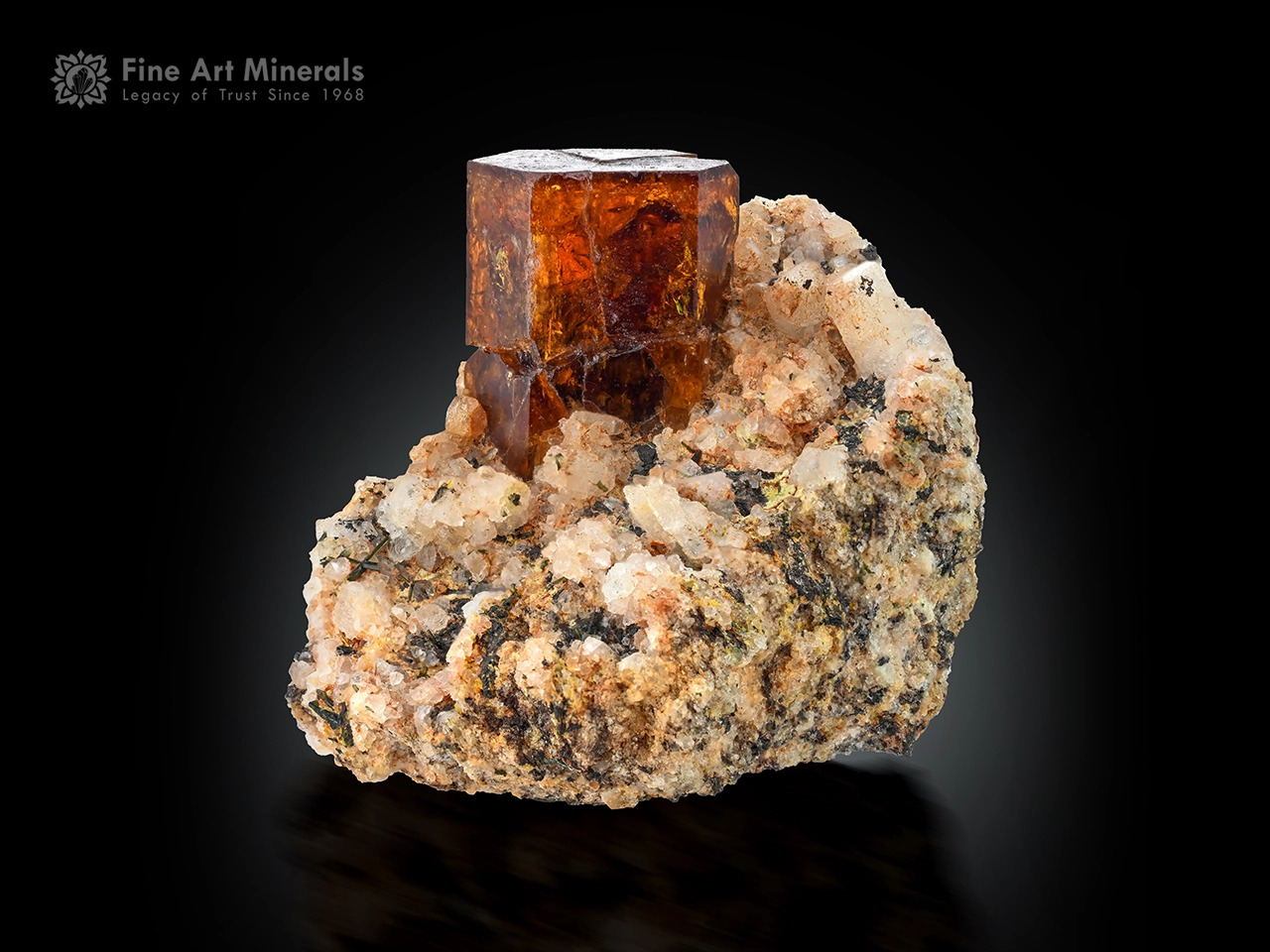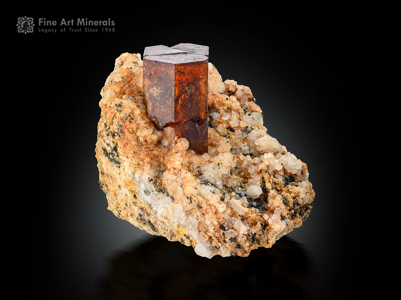 This attractive specimen features a bastnasite crystal, aesthetically positioned on an albite matrix, offering a strong, well-balanced display. The crystal shows a pleasing form with good natural luster, and its warm tones contrast nicely with the lighter albite. Originally, this was a single bastnasite crystal that became separated into three parts during extraction from the mine and was later carefully repaired and reassembled. The specimen is fully self-standing, presents well from multiple angles, and retains excellent overall aesthetics, making it a very appealing display piece.