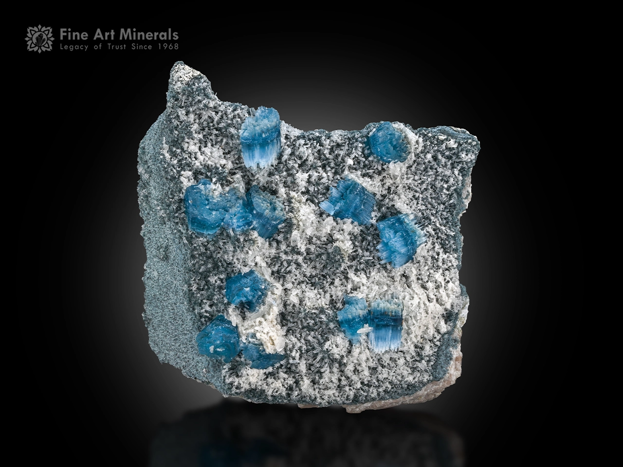 The arrangement is highly aesthetic, featuring multiple crystals arranged in an eye-catching composition that showcases clarity, brilliance, and contrast against the host matrix. Distinguished by quality and visual harmony, this specimen represents a rare and collectible example of blue Beryl from a classic Afghan locality, making it an ideal addition for advanced collections of pegmatite minerals.