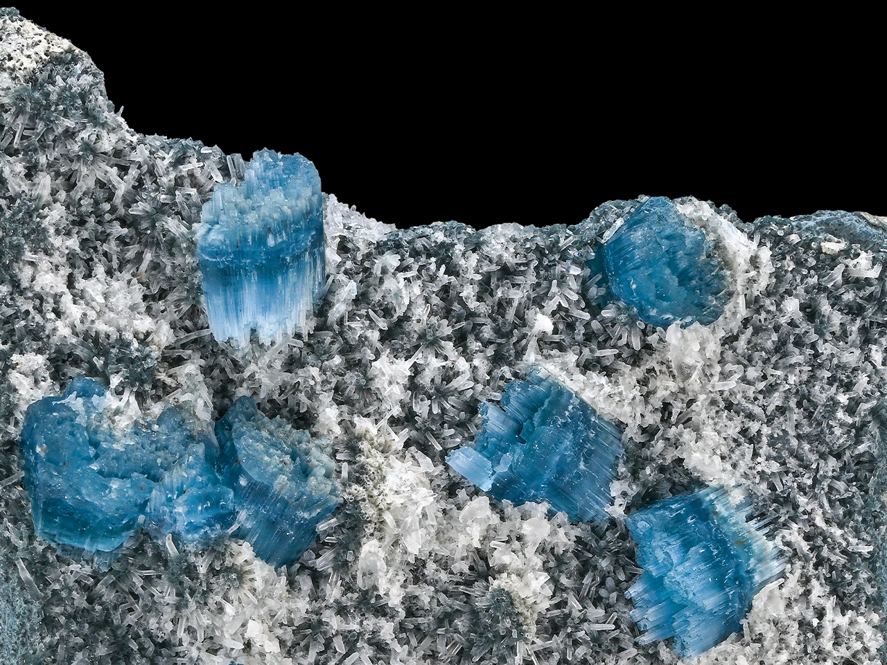 Sky-blue alkali-rich Beryl crystals on matrix from the Deo Darrah area in Badakhshan Province, Afghanistan. The crystals display vibrant color, excellent luster, and delicate translucency, creating a striking aesthetic presence. The crystals show excellent etched formation, enhancing both symmetry and balance across the matrix.