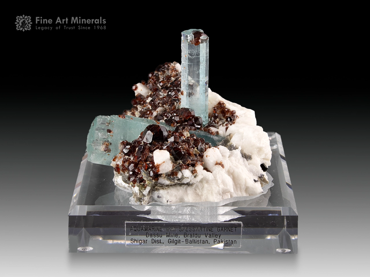 This is a fascinating and rare combination specimen from the famed Shengus Mine in the Rondu District, Gilgit-Baltistan, Pakistan. Lustrous sky-blue aquamarine crystals rise from a richly textured matrix, beautifully contrasted by deep-red garnet crystals scattered across the surface. A prominent prismatic aquamarine stands upright with a strong presence, accompanied by smaller crystals extending along the sides, giving the piece a natural, sculptural character. The crystals show classic alpine form with fine growth features and pleasing internal character. The main aquamarine has been carefully repaired at the base, well stabilized, and neatly integrated, allowing it to maintain its visual strength. The vivid contrast between cool blue aquamarine and warm red garnet makes this a very attractive and display-worthy specimen.