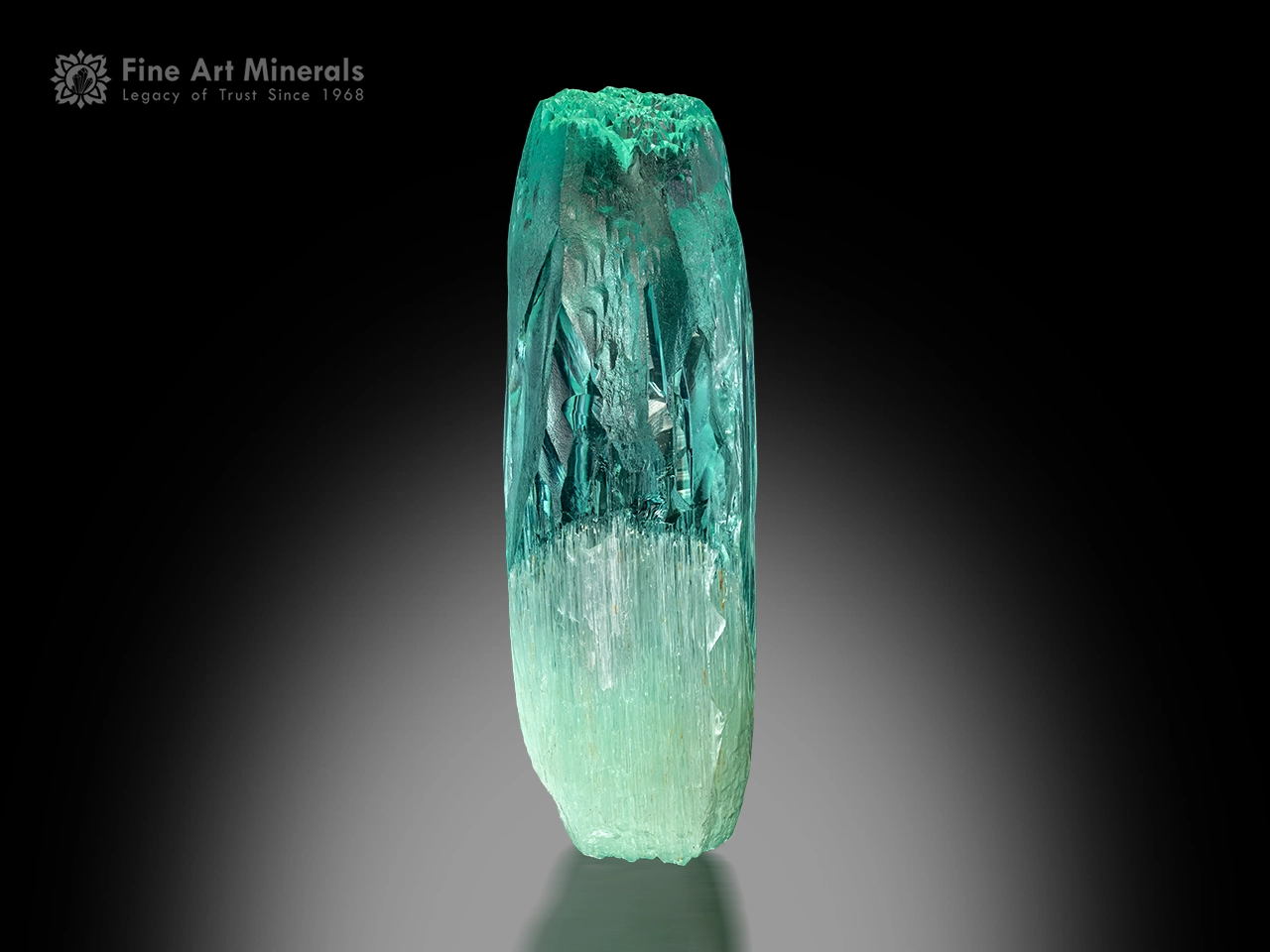 This is a truly exceptional aquamarine crystal, distinguished by its elongated, sculptural form and a captivating sea-green to bluish tone. The crystal displays remarkable transparency, allowing light to pass through it and reveal intricate internal textures and growth features. Fine vertical striations run along the prism faces, adding both character and a sense of natural elegance to the piece. The termination shows a complex and slightly rugged texture, enhancing its authenticity and untouched natural presence. Subtle color zoning, transitioning from deeper tones in the upper section to lighter, more ethereal hues toward the base, gives the specimen a striking visual depth. With its refined shape, excellent clarity, and luminous color, this aquamarine stands as a superb example of the species and offers a strong aesthetic presence worthy of a high-end collection. Completely pristine, with no dings or damage, this is a refined example from Jaqueto Mine.