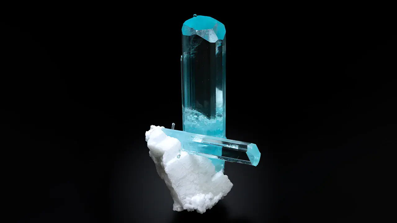 Blue beryl is colored mainly by Fe²⁺, sometimes with a gentle greenish push from Fe³⁺. It typically forms long, glassy hexagonal prisms with sharp terminations and clean faces, often on feldspar and quartz. Fluid inclusions and mica flakes are common and can add character without spoiling transparency.
