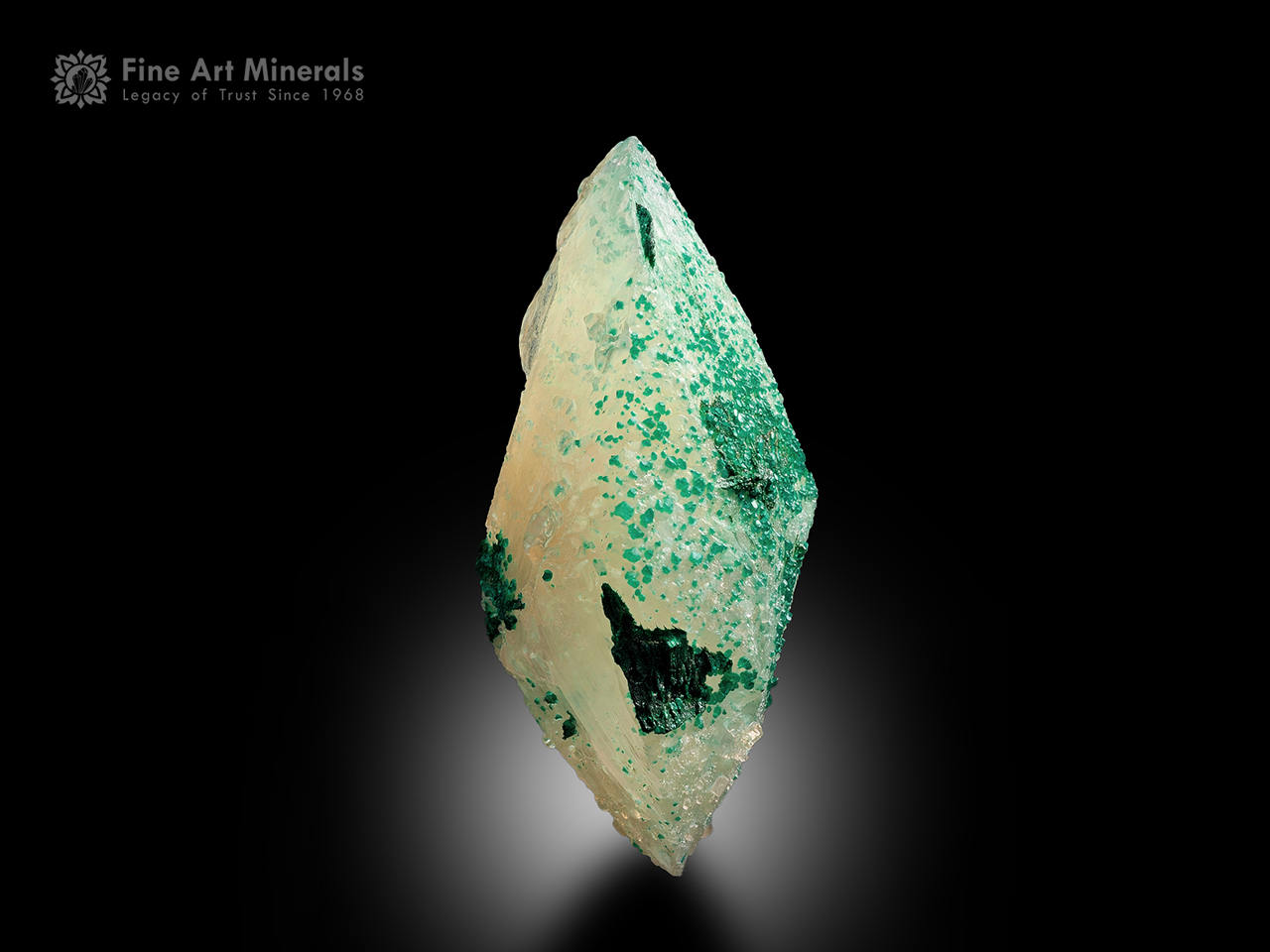 A striking scalenohedral calcite crystal, sharply formed and beautifully elongated, displaying a classic double-terminated appearance with crisp edges and well-defined faces. The calcite shows a soft, creamy to pale mint body color, providing an exceptional natural canvas for the vivid emerald-green dioptase spray scattered across the crystal surfaces.