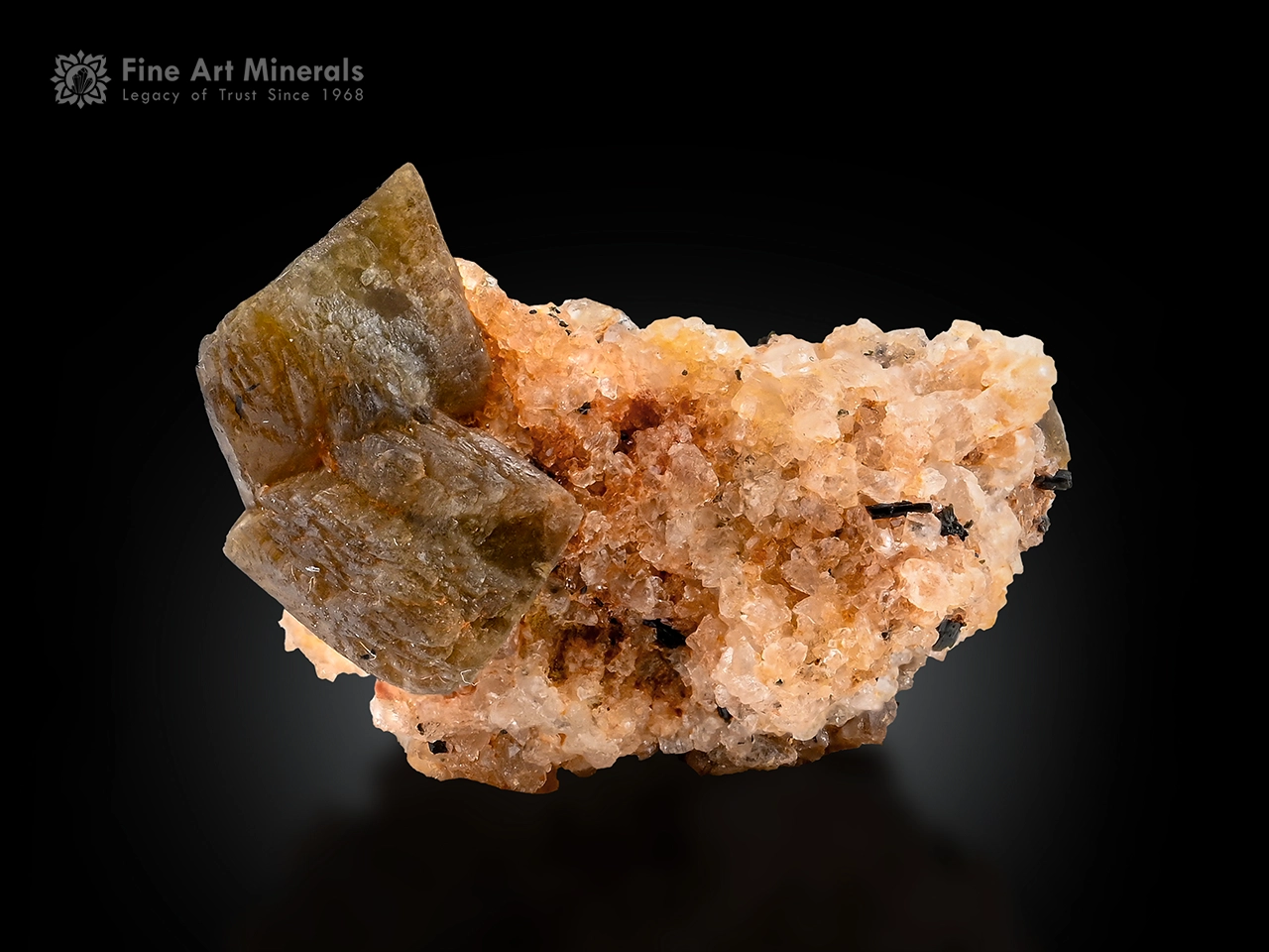 Hingganite is a rare beryllium yttrium silicate mineral, appreciated by collectors for its scarcity and typically well-defined crystal forms in small sizes. This is another attractive specimen featuring a well-shaped hingganite crystal measuring approximately 0.9 cm, set on a richly textured albite matrix. The crystal displays a pleasing, slightly inclined form with good definition, giving it a natural and balanced presence. The warm tones of the albite, combined with scattered dark inclusions, provide an appealing contrast that enhances the visibility of the hingganite. Overall, a compact and aesthetic piece with strong character and collector appeal.