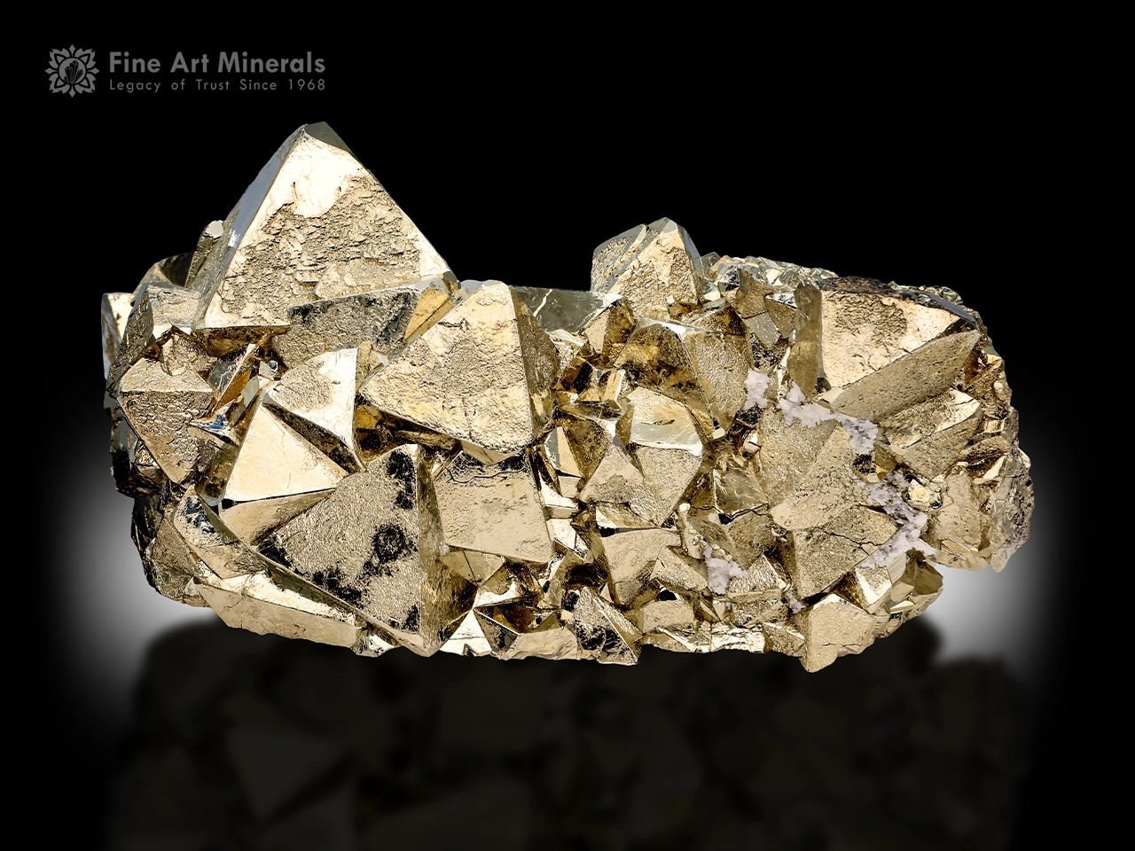 A visually impressive pyrite specimen from Peru, showcasing a wonderful elongated shape and strong sculptural presence. The intergrown crystals display crisp geometry and bright metallic luster, reflecting light beautifully across the broad, sharply defined faces. The overall form is dynamic and well-balanced, giving the specimen a commanding appearance and excellent display appeal. A striking and elegant example of classic Peruvian pyrite.