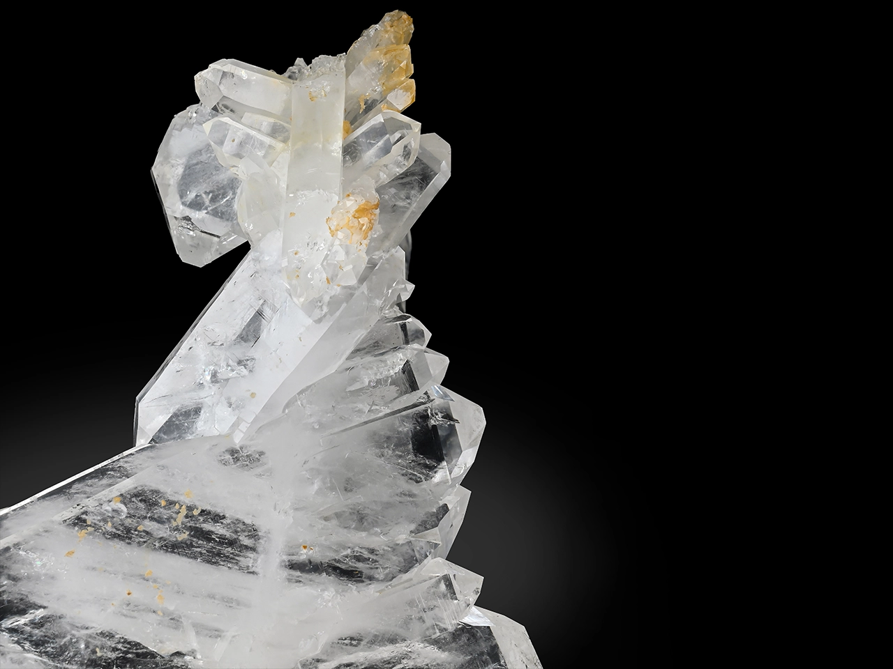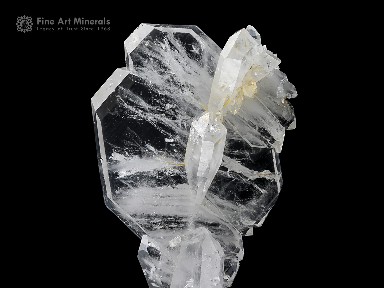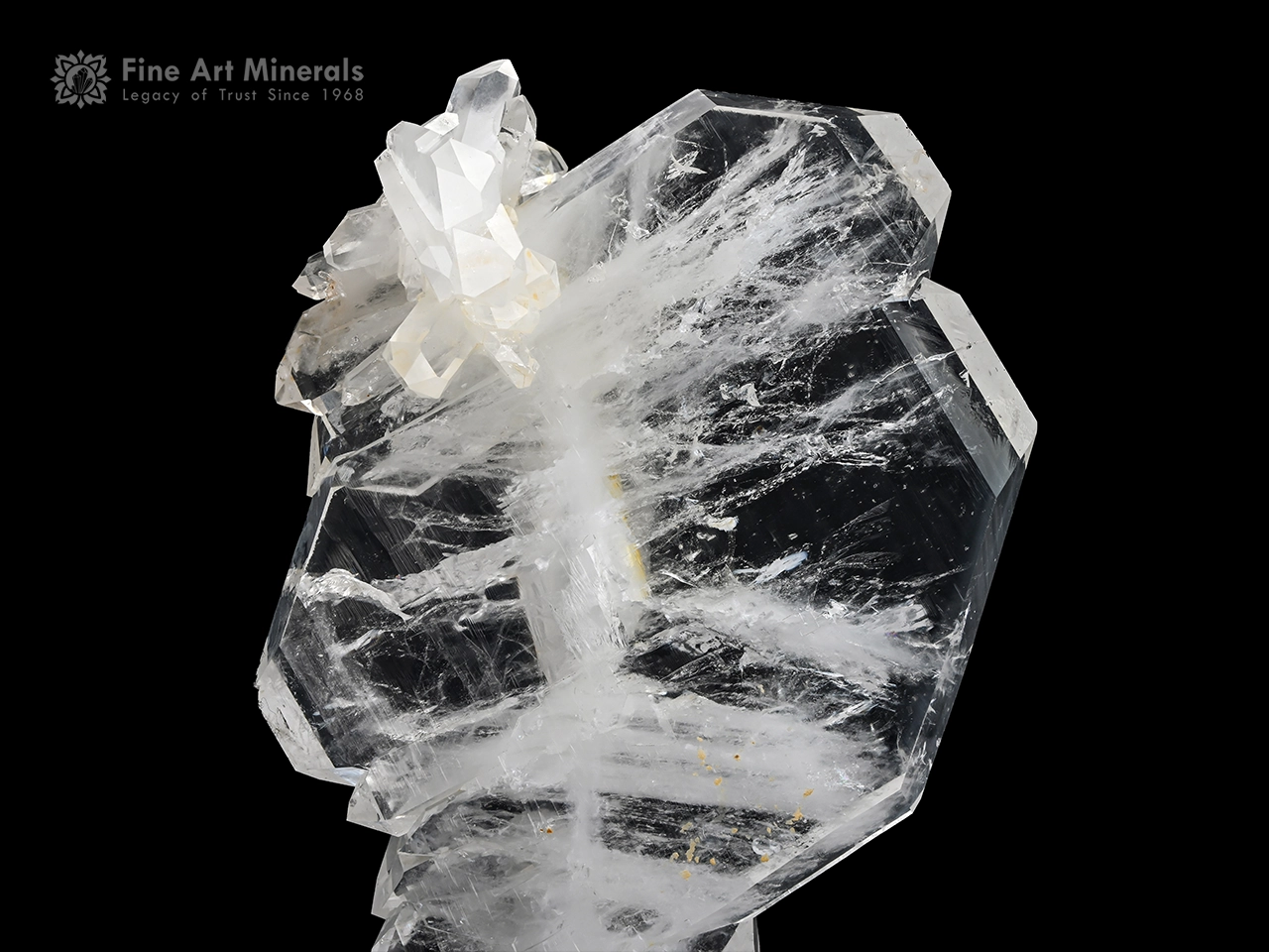 A striking Faden Quartz specimen featuring a well-defined central “faden” line running through a broad, glassy crystal plate. The piece displays excellent transparency with intricate internal veils and natural growth patterns that add depth and character. Multiple well-formed crystals are aesthetically arranged across the surface, enhancing the three-dimensional appeal of the surface. The overall structure is balanced and visually captivating, making it a standout display specimen with strong presence and natural elegance.