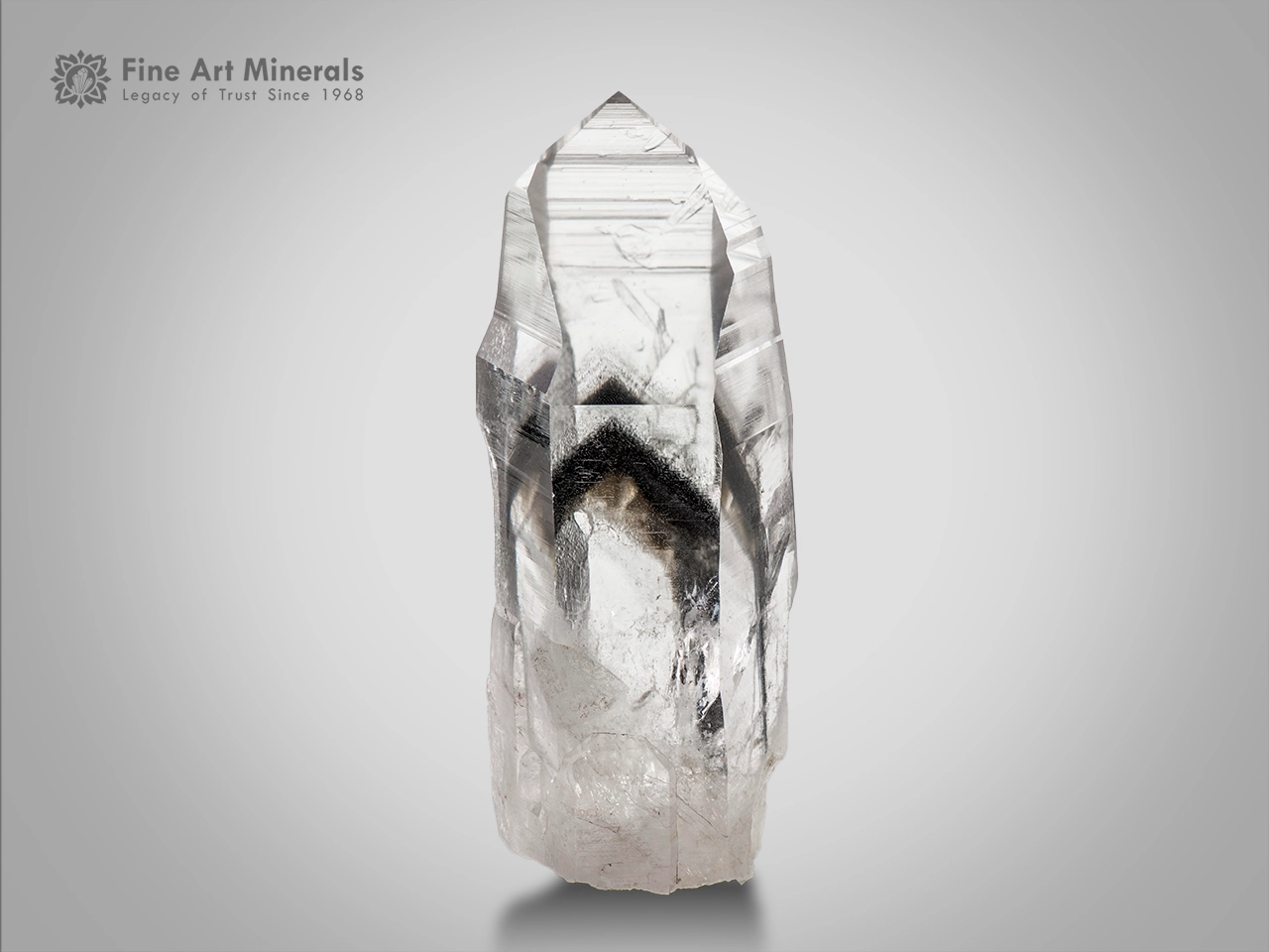 Presenting a truly magnificent quartz crystal, remarkable for both its size and its breathtaking transparency. This “fatty” quartz is superbly gemmy, with sharp, pristine terminations that reflect its exceptional quality. What makes it stand out even more is the striking black chlorite inclusion within the crystal, creating a dramatic and elegant contrast that elevates its overall aesthetic to a museum-level quality.
