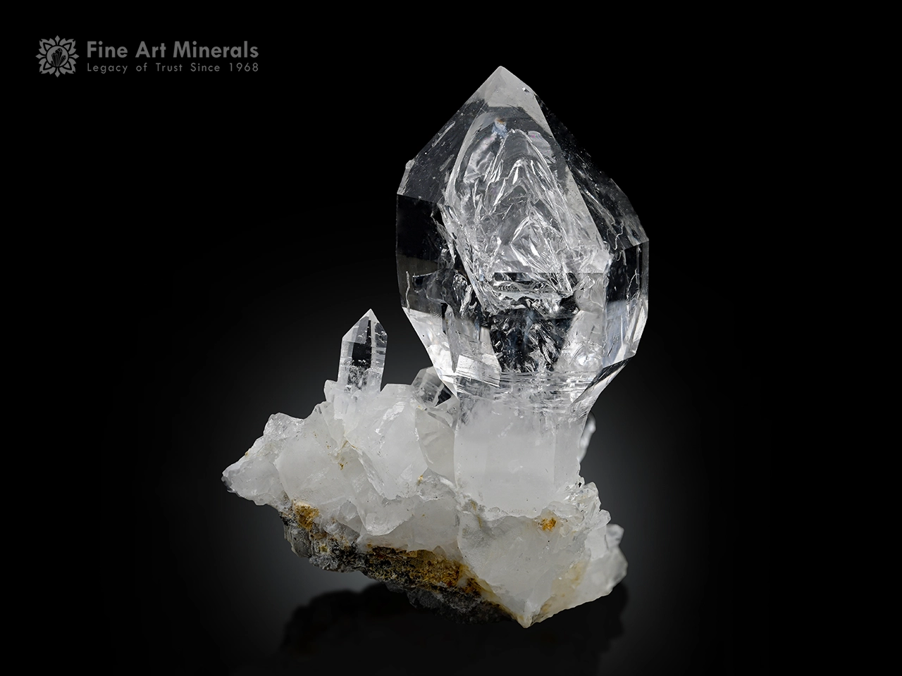 A captivating quartz specimen from Pakistan, featuring a prominent crystal exhibiting a subtle micro scepter habit, rising elegantly above a compact cluster of smaller crystals. The main crystal shows excellent transparency and a well-defined termination, while the delicate scepter development adds a distinctive, collectible character. The surrounding crystals form a supportive base, enhancing the overall composition and giving the piece a balanced and refined appearance. The specimen presents beautifully from the front, offering a superb display with strong aesthetic appeal. Quartz is widely appreciated for its clarity, durability, and the remarkable diversity of crystal habits it can naturally develop.