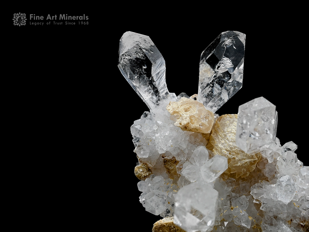 Reminiscent of a natural sculpture, this beautiful quartz specimen from Pakistan presents an elegant arrangement of well formed crystals rising from a textured matrix. Two elongated crystals at the top create a striking and dynamic silhouette, complemented by additional crystals that add depth and complexity to the composition. The crystals show good transparency and a crisp luster, while the contrasting matrix enhances the overall visual impact. The piece feels lively and well-balanced, offering a distinctive display from multiple angles. Quartz is widely admired for its clarity, durability, and the remarkable variety of crystal habits it can naturally develop.