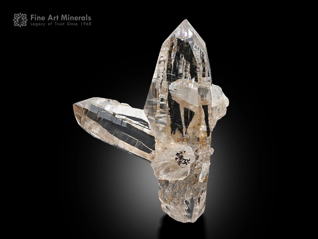 This quartz specimen presents an elegant, well-balanced form, with a beautifully developed main crystal and a secondary crystal that enhances its overall composition. The surfaces display a bright, glassy luster that immediately draws attention, while the clarity is excellent, allowing a clear view into the crystal with subtle internal features adding depth and character. The termination is sharp and well-preserved, and the overall condition is very good, maintaining a clean, refined appearance. At the base, a delicate siderite spray provides a pleasing natural contrast, adding warmth and visual interest to the composition. The combination of clarity, luster, and form makes this a highly attractive display specimen with strong aesthetic appeal.