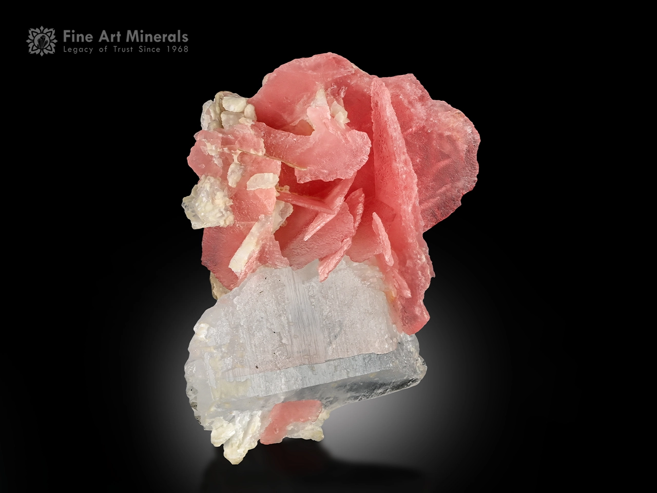 A truly breathtaking Rhodochrosite flower on Quartz with albite. The sharp, bladed crystals of Rhodochrosite radiate with stunning elegance, perfectly complemented by the sparkle of quartz and albite. Almost every crystal is beautifully terminated, creating a spectacular balance of form, luster, and color. The aesthetics of this specimen are magnificent, and what makes it even more special is that it comes with no significant damage.