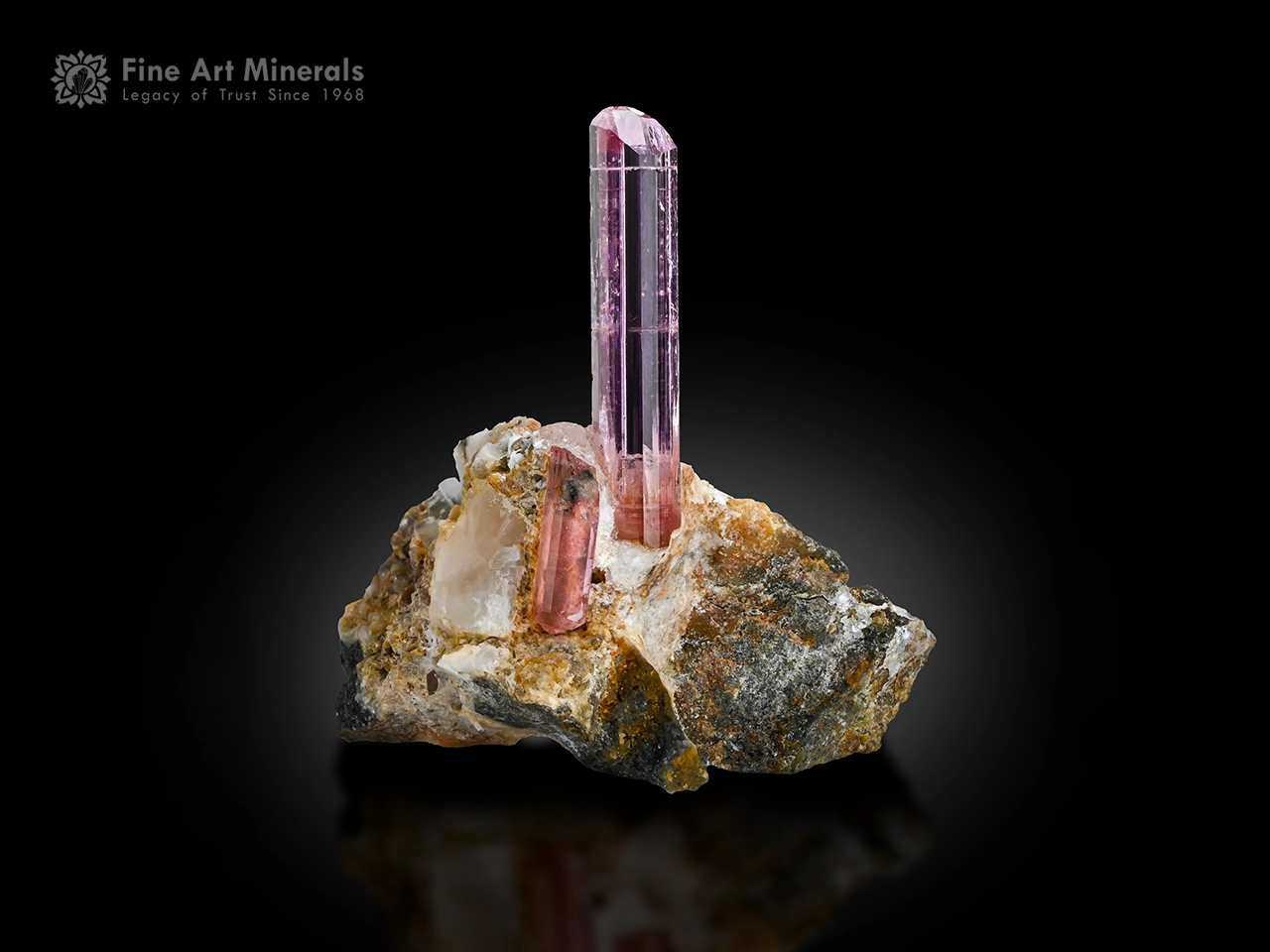A striking pink topaz crystal rises elegantly from its natural matrix, immediately capturing attention with its vivid, saturated pink to soft lavender hue and exceptional transparency. The main crystal measures 4 cm in length and shows a clean prismatic form with bright luster and remarkable gemminess, giving the specimen a refined presence. A smaller accompanying crystal, approximately 1.6 cm long, sits just beside the base of the main crystal, adding pleasing balance to the overall composition. Although the main crystal has two repairs, its visual impact, size, and color remain outstanding, and the display quality is truly impressive.