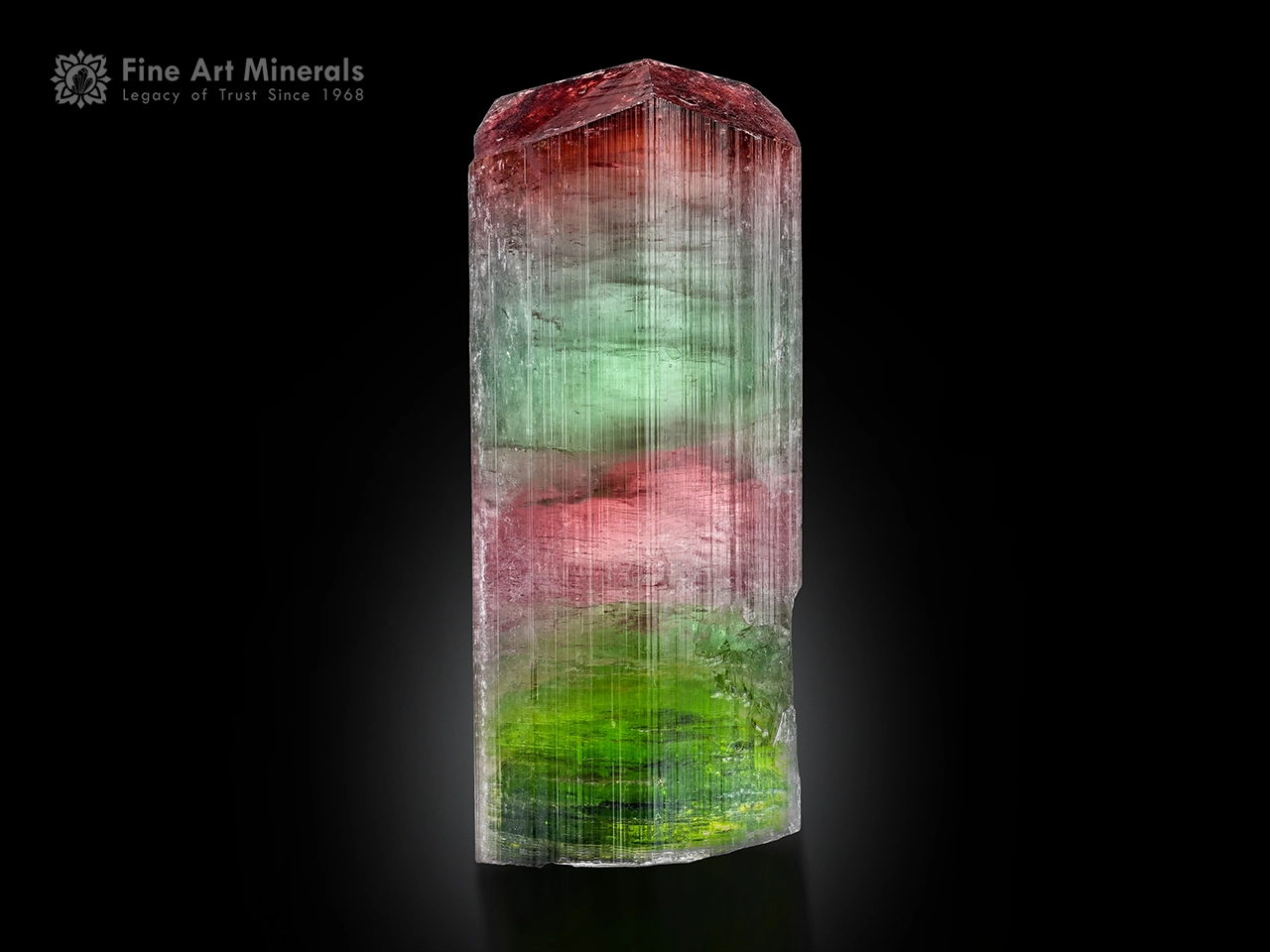 A truly eye-catching elbaite, this crystal features striking variegated color zoning and immediately stands out for both its beauty and presence. In hand, the colors appear even more vivid and nuanced, beginning with a rich, slightly wine-toned red termination that carries a gentle translucency. This transitions seamlessly into a soft blush-pink zone, followed by a luminous mint-to-bluish-green core that gives the crystal a refreshing, almost glowing effect. Toward the lower section, the color intensifies into a deeper, grassy-to-olive green, with subtle variations that create a sense of depth and internal movement. The transitions are smooth yet clearly defined, forming natural horizontal bands that enhance the piece’s layered character. The interplay between the warmer upper tones and the cooler green core creates a beautifully balanced and visually engaging contrast.
