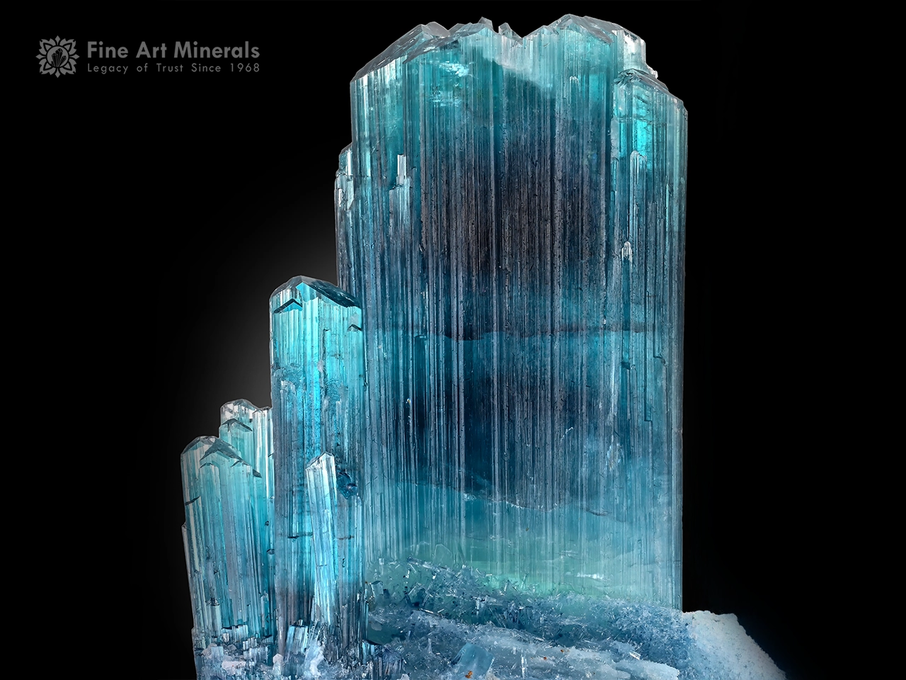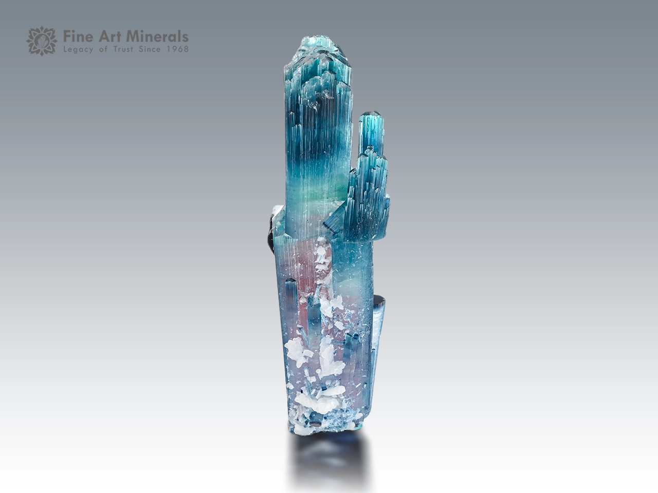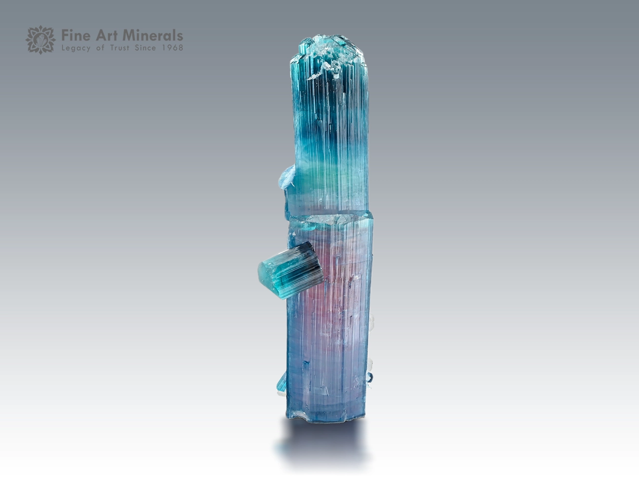A striking bi-color tourmaline crystal displaying a smooth blend of soft pink tones rising into vibrant blue-green hues. The crystal is well-formed with sharp prismatic structure, fine vertical striations, and an attractive cluster of side crystals that add depth and balance. Two small repairs are present but remain subtle and do not impact its overall display quality. The color zoning and elegant form give this piece a refined and eye-catching presence, making it a truly beautiful specimen.